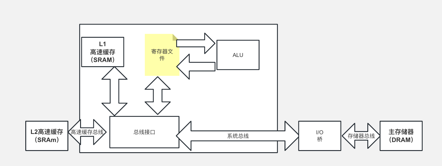 一个典型的高速缓存存储器。位于处理器芯片上的L1高速缓存的容量可以达到数万个字节,访问速度几乎和访问寄存器的文件一样。一个容量为数十万到数百万的更大的L2高速缓存是通过一条特殊的总线连接到处理器的。访问L2的开销要比访问L1的开销大5倍,但是仍然比访问主存的时间快5~10倍。L1和L2高速缓存是一种叫做静态随机访问存储器的硬件技术实现的。
