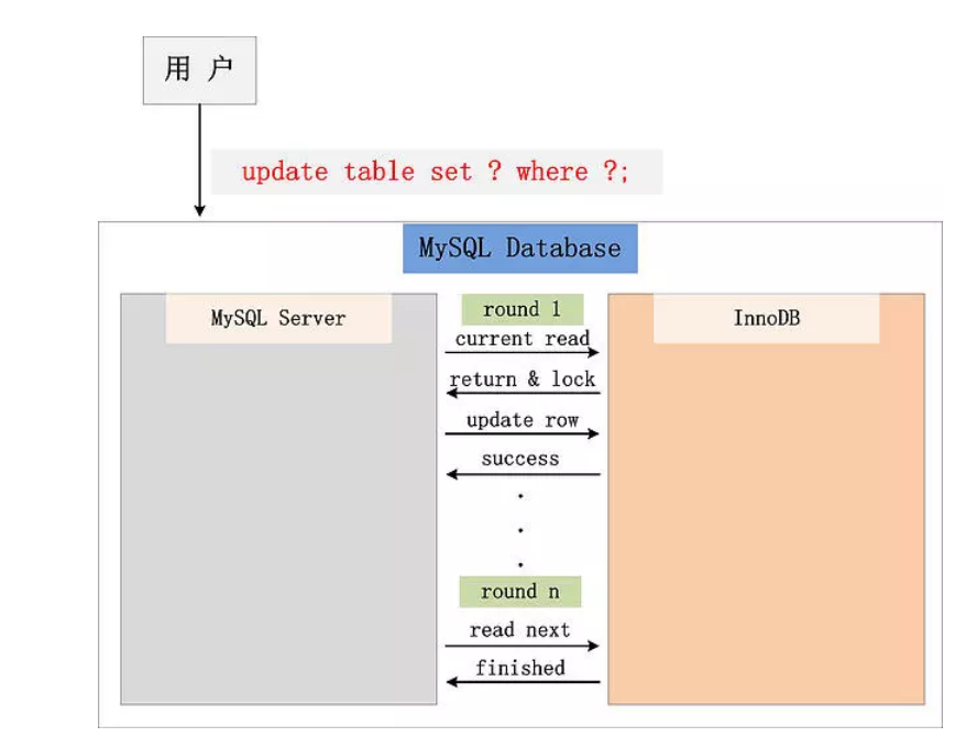为什么将 插入/更新/删除 操作,都归为当前读?可以看看下面这个 更新 操作,在数据库中的执行流程: