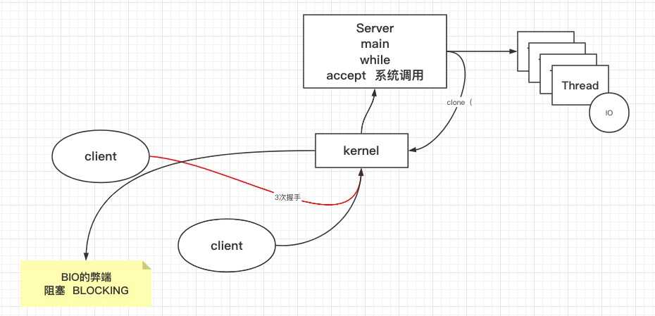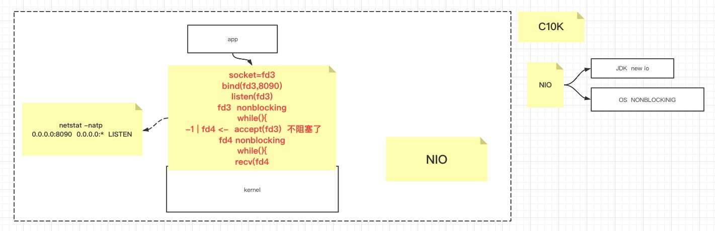 BIO 慢,为了解决这个问题。 要找到弊端:阻塞,accept阻塞,read阻塞。因为阻塞,抛出线程,每个线程互不影响,抛出多个线程。java中的线程是linux的子进程,上下文切换(用户态内核态切换)非常消耗性能。 阻塞是内核限制的,只有内核能解决。内核新增 NOBLOCKING