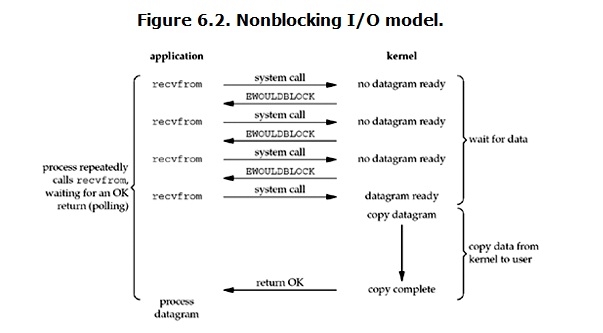 当用户进程发出read操作时,如果kernel中的数据还没有准备好,那么它并不会block用户进程,而是立刻返回一个error。从用户进程角度讲 ,它发起一个read操作后,并不需要等待,而是马上就得到了一个结果。用户进程判断结果是一个error时,它就知道数据还没有准备好,于是它可以再次发送read操作。一旦kernel中的数据准备好了,并且又再次收到了用户进程的system call,那么它马上就将数据拷贝到了用户内存,然后返回。
