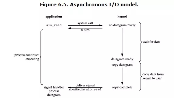 用户进程发起read操作之后,立刻就可以开始去做其它的事。而另一方面,从kernel的角度,当它受到一个asynchronous read之后,首先它会立刻返回,所以不会对用户进程产生任何block。然后,kernel会等待数据准备完成,然后将数据拷贝到用户内存,当这一切都完成之后,kernel会给用户进程发送一个signal,告诉它read操作完成了。