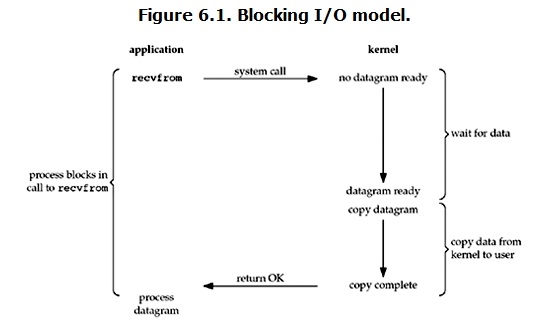 在linux系统中,默认所有的socket都是blocking,一个典型的读操作流程大概是这样: