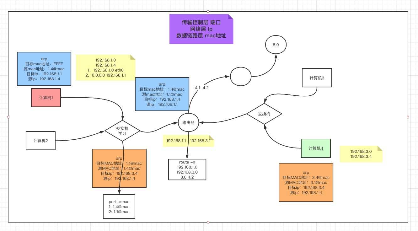 应用层:格式化字符串 传输控制层:处理包 3次握手 4次分手 源端口号->目标端口号 网络层:网络号 主机号 下一跳 (成本低且传输可靠) 源IP地址->目标IP地址 数据链路层:mac地址 下一跳的mac地址 源MAC地址->目标MAC地址