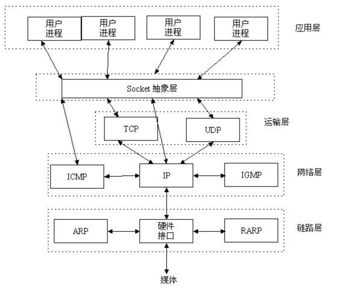 TCP/IP协议栈主要分为四层:应用层、传输层、网络层、数据链路层,每层都有相应的协议。