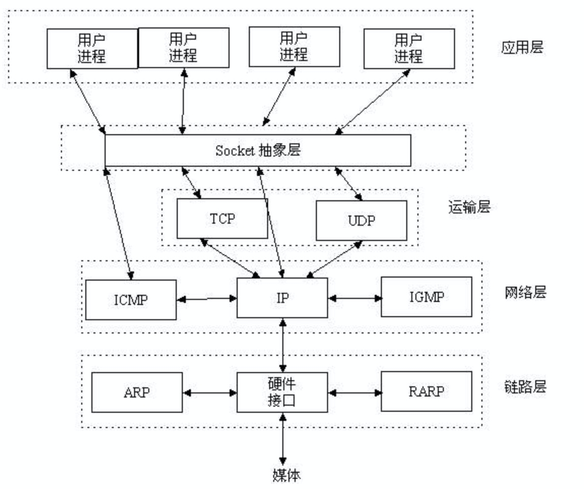 SOCKET: 套接字,TCP/IP网络的API。(港口码头/车站)Socket是应用层与TCP/IP协议族通信的中间软件抽象层,它是一组接口。socket是在应用层和传输层之间的一个抽象层,它把TCP/IP层复杂的操作抽象为几个简单的接口供应用层调用已实现进程在网络中通信。