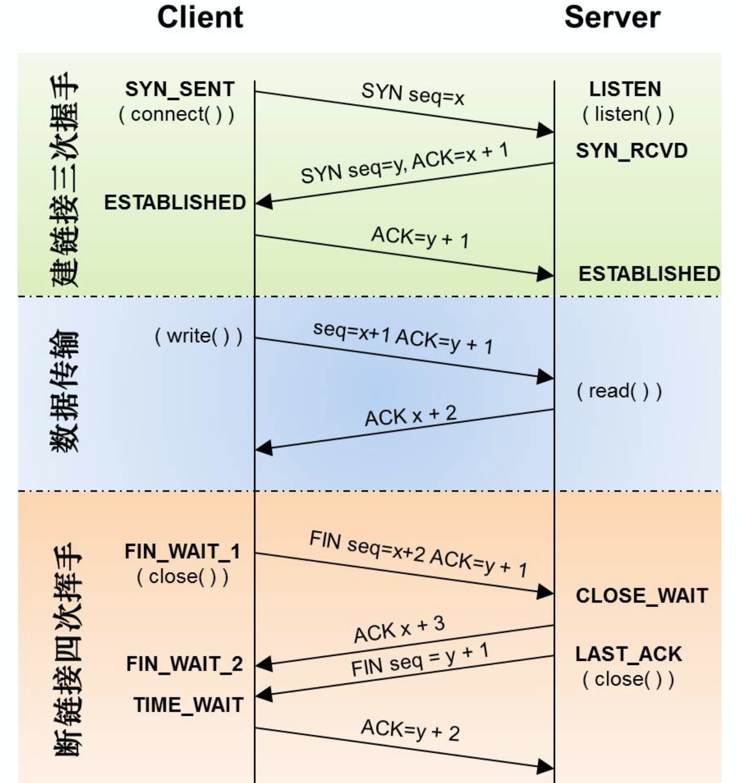 第三次握手:客户端收到服务器的SYN+ACK包,向服务器发送确认包ACK(ack=y+1),此包发送完毕,客户端和服务器进入ESTABLISHED状态,完成三次握手。